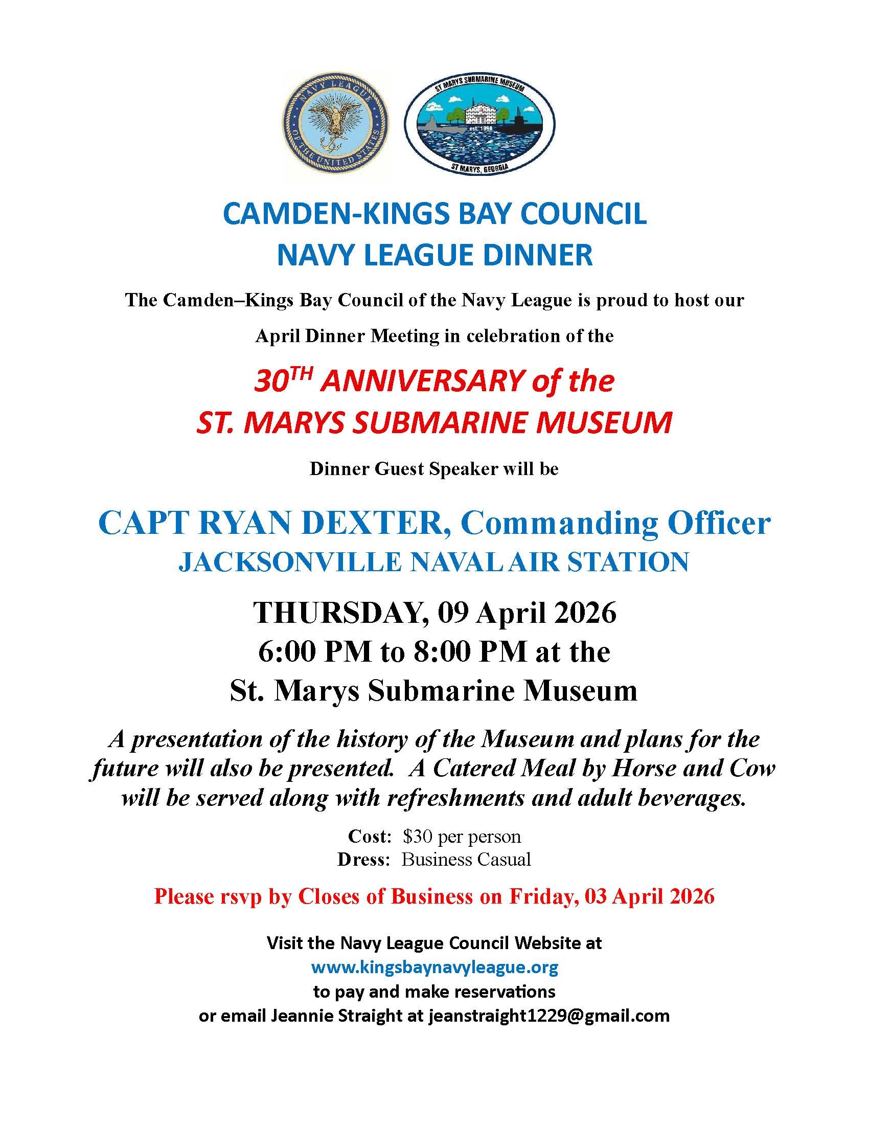 The cost is $30 per person, with a delicious buffet. Reservations are needed by April 5th. Sign-up on our web site at KingsBayNavyLeague.org or click Register Now or contact Jeannie Straight at 912-882-4142 or by email to jeanstraight1229@gmail.com.